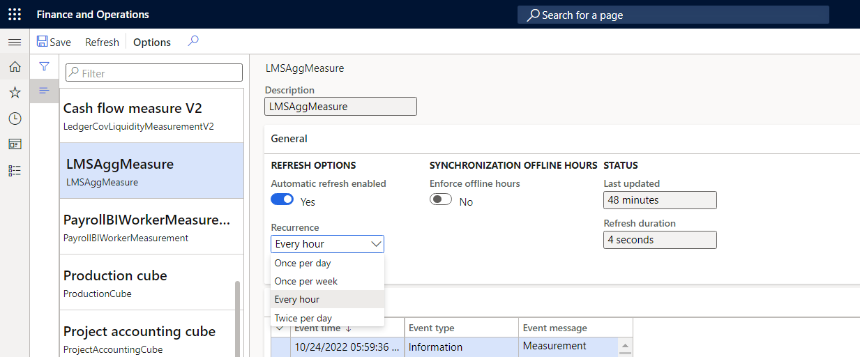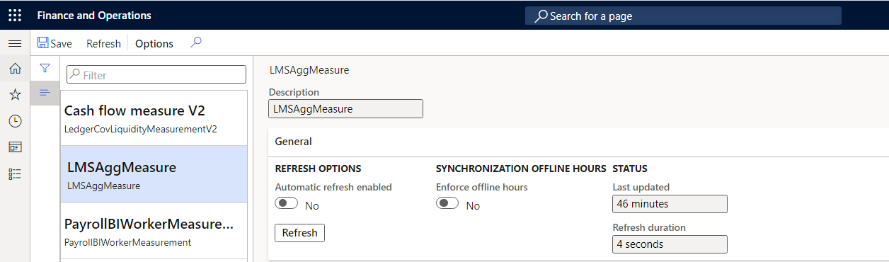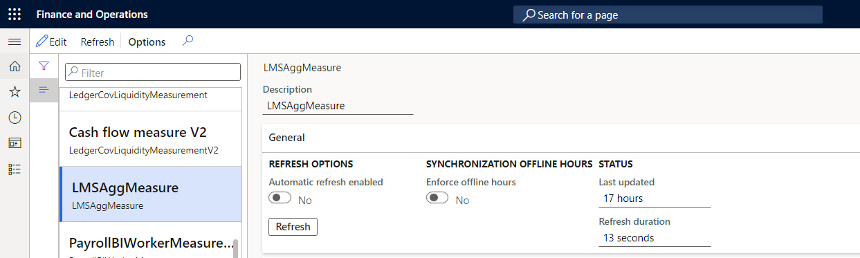 From the D365 FO environment, go to the Entity store (Modules > System administration > Set up > Entity store) and look up the aggregate measurement you just created and click ‘Refresh’.