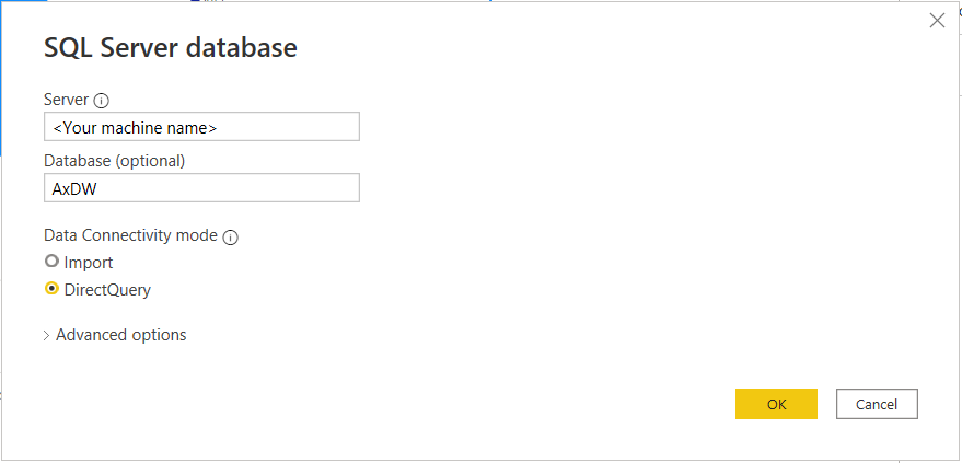 Open Power BI desktop. Go to Get data > SQL Server. Fill the required information as follows.