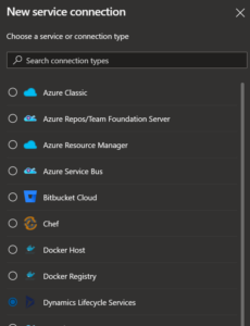 Click ‘ New service connection’ and select “Dynamics Lifecycle Services” and click Next.