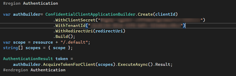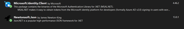 The NuGet packages we use to create 2the connection are Microsoft.Identity.Client and Newtonsoft.Json.Linq