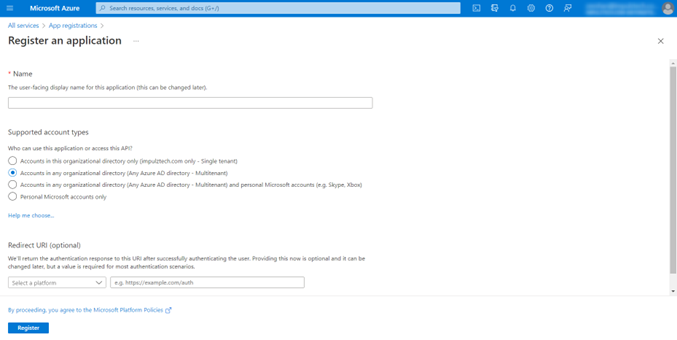 To create a client application, we will have to login Microsoft azure portal. Under services search for App Registrations and create a new registration. The registration page will look like the snapshot below: