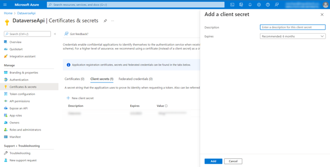 For client secret we will head to Manage > Certificates & Secrets and add a client secret. Please note that Client secret values cannot be viewed, except for immediately after creation. Be sure to save the secret value when created before leaving the page since we will be needing this to generate the token.