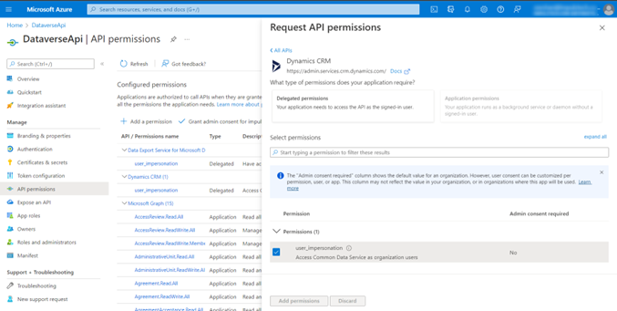 Lastly in Azure portal, head to Manage > API permissions > Add permission then search for Dynamics CRM and select user_impersonation and add it.