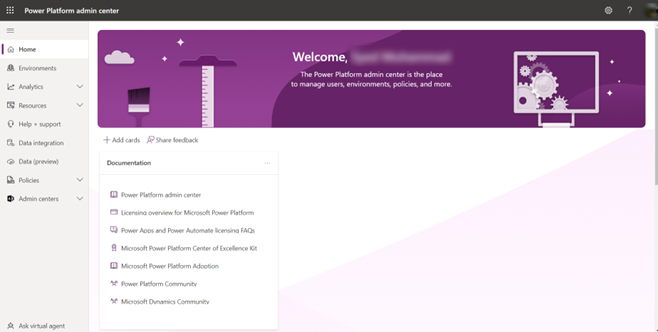 To link Azure client application just registered with Power Apps, login to Power Apps > Settings > Admin Centre.